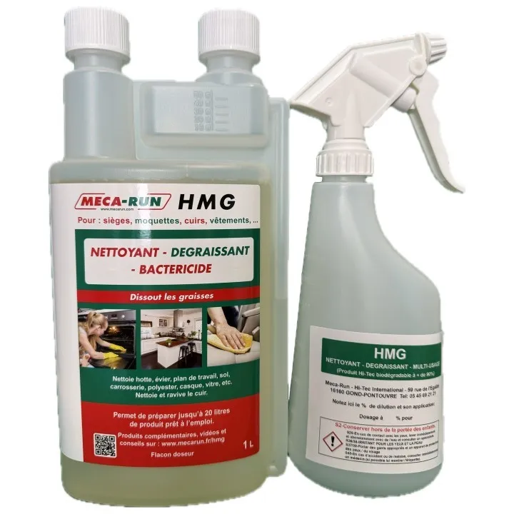 Le Méca-Run H.M.G est un produit spécialement conçu pour le nettoyage de toutes surfaces à la maison comme dans une entreprise (dilution à 5 %), laisser agir quelques minutes, rincer, essuyer ou passer l'aspirateur.